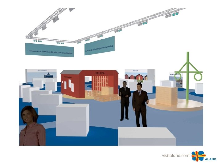 Montern Skärgården • Den blåa mattan med blå bollar ska symbolisera olika öar. I montern finns förutom Åland; Åbo, Björneborg/ Raumo, Pargas, Nådendal, Kimitoön, Salo och St. Karins. • Mitt i montern kommer det att finnas en Matvarubod som kommer att sälja produkter från alla regioner i montern. Kimitoön har ansvaret för boden. • Intill matvaruboden ges utrymme till en ”programplats” och en åländsk midsommarstång. Vid programplatsen får varje region sätta upp olika programpunkter (tex. sång, musik, aktiviteter) under mässdagarna. • Åland ansvarar för midsommarstången och kommer att koordinerar en midsommarfest under mässans alla dagar. • Arbetsgruppen för montern har strategidagar 13 -14. 10 på Åland för att diskutera och fastställa riktlinjer för handelsboden, programtider, marknadsföring etc.