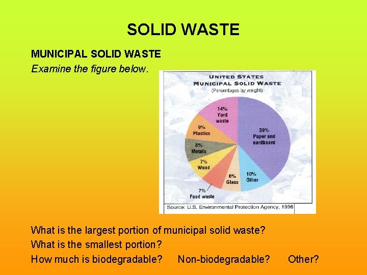 SOLID WASTE MUNICIPAL SOLID WASTE Examine the figure below. What is the largest portion of municipal solid waste? What is the smallest portion? How much is biodegradable? Non-biodegradable? Other?