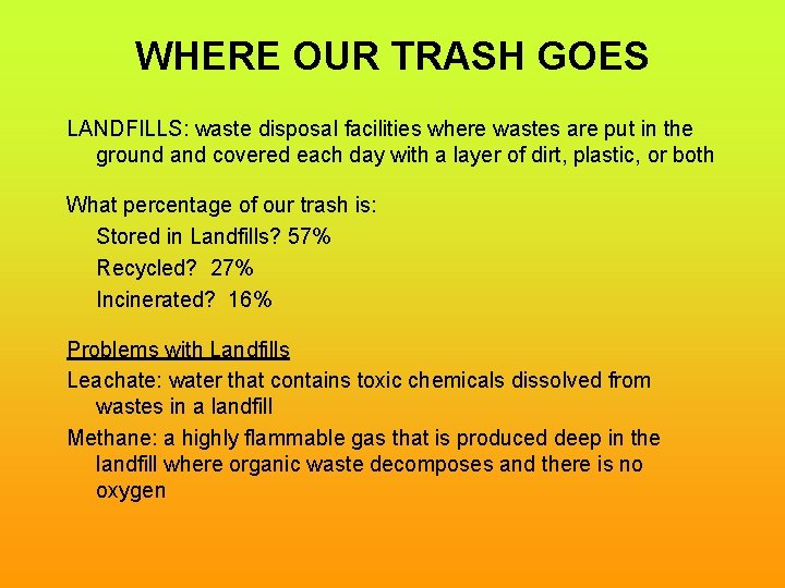 WHERE OUR TRASH GOES LANDFILLS: waste disposal facilities where wastes are put in the ground and covered each day with a layer of dirt, plastic, or both What percentage of our trash is: Stored in Landfills? 57% Recycled? 27% Incinerated? 16% Problems with Landfills Leachate: water that contains toxic chemicals dissolved from wastes in a landfill Methane: a highly flammable gas that is produced deep in the landfill where organic waste decomposes and there is no oxygen