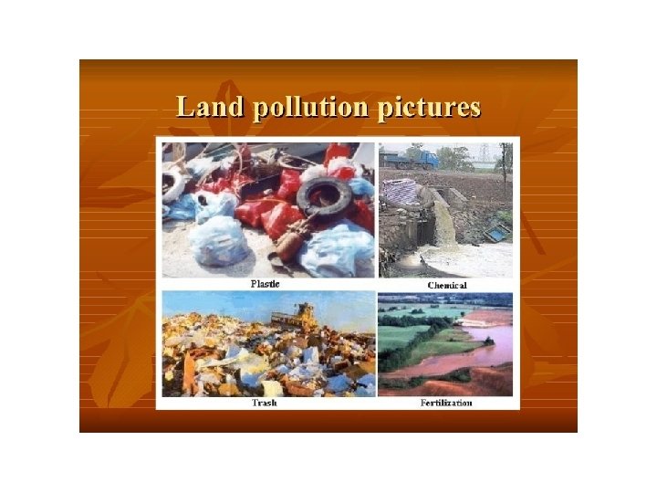 Types of land pollution • • Pesticides and Fertilizers Chemicals Deforestation Solid Waste