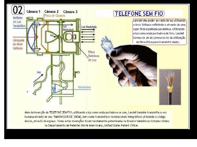 LANDELL DE MOURA, PIONEIRO DAS TELECOMUNICAÇÕES 1801 Criada a primeira bateria. 1830 Descoberto por Faraday o princípio do gerador elétrico. 1844 A primeira transmissão telegráfica a distância coube a Morse, nos Estados Unidos. 1850 Surgiram os cabos submarinos que uniram a Inglaterra à França. 1852 em 11 de maio de o Brasil, a primeira linha de telégrafo elétrico nacional foi inaugurada em, ligando a Quinta Imperial e o Quartel de Campo , no Rio de Janeiro. 1858 Foi lançado o primeiro cabo submarino metálico transatlântico interligando a América do Norte e a Inglaterra, ainda experimental. 1856, Ocorre a primeira transmissão da palavra falada através de fios, numa conquista do italiano Antonio Meucci