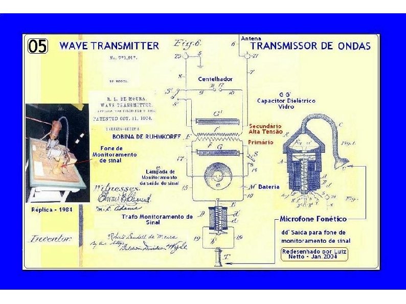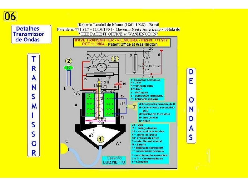 a patente 771. 917 , para um transmissor de ondas Trata-se de um radio que transmitia fonia utilizando o gerador de Hertz e o coesor de BRANLY , esse transmissor foi reproduzido no Rio Grande do Sul em 1984 e comprovada seu funcionamento. 775. 337 para um telefone sem fio Trata-se de um radio que transmitia fonia utilizando luz de através de um componente de Selenium. Isto mostrou que ele estava a frente de seu tempo. 775. 846 para um telégrafo sem fio Trata-se de um telegrafo sem fio semelhante ao de Marconi , porém com um sistema de amplificação de audio.
