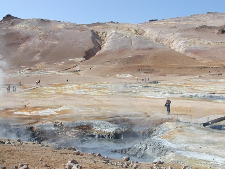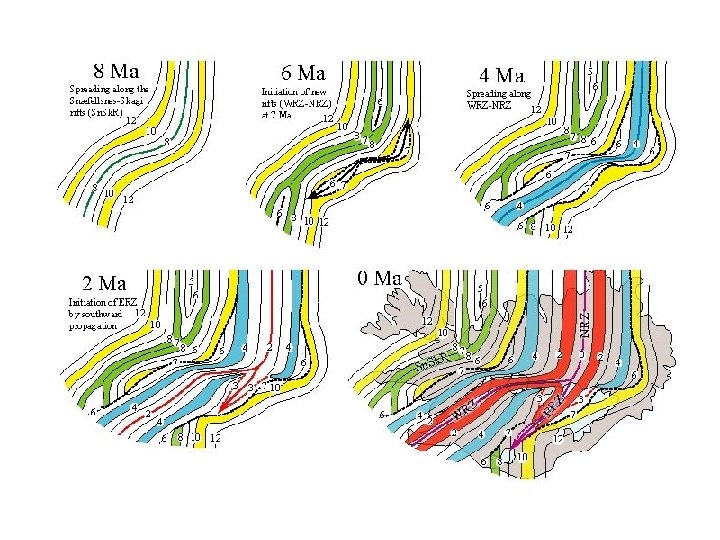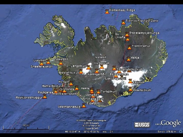 Historically active volcanoes, fissures related to rifting, geothermal systems, and basic and intermediate lavas and associated sediments less than 700, 000 years old (pink). The younger volcanism and rifting are confined to the active volcanic zone (northern, western, eastern) and three off-ridge areas. High-temperature geothermal systems (>200ºC) like Svartsengi and Reykjanes are associated with the active volcanic zone. Orange and gray indicate progressively older igneous rocks and associated sediments. Low-temperature geothermal systems (<150ºC) are found on the flanks of the active volcanic zone in older rocks. The white areas are glaciers and ice caps.