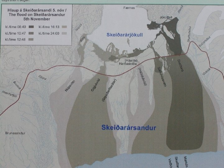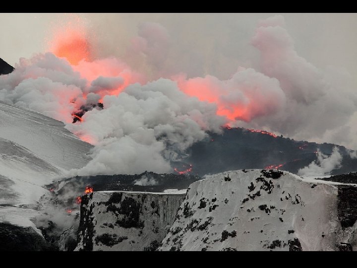 The eruption at Eldgja in ~935 AD lasted 3 -8 years and produced 19. 6 cubic km of lava, making it the largest basaltic flood lava eruption in historic time. The fissure was about 30 km long. An estimated 219 Mt of SO 2 was released to the atmosphere during the eruption.