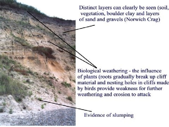 Erosional Factors • Biological Factors – Vegetation provides protection and stabilises cliff face and biotic weathering • Meteorological Factors – Frequency of storms, aspect, wind, temp range and rainfall • Geomorphologic Factors - fetch, wave type, presence of beach material, movement of material along the coastal zone, sea depth, tidal conditions • Human Activity – Cliff top development, cliff defences, changes in beach material, ie. removal for building sand or artificially adding material • Geological – rock hardness (granite recession rate 1 mm/yr; chalk 1 -10 cm/yr and glacial deposits 1 -10 m/yr). Joints, bedding planes, fault-lines and topography (relief of the land).