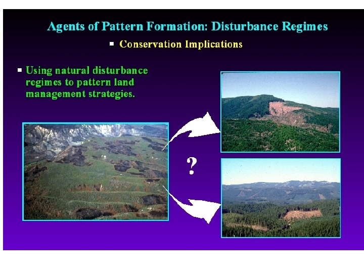 Landscape Disturbance • Characteristics of Regime: – – Area/size Spatial dist’n Frequency Recurrence interval – – Predictability Intensity/severity Synergisms Feedbacks