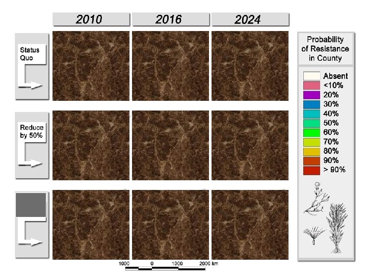 Spatial Movement (First Detection) n Data: Presence/absence by county by year n Distribution of “high quality” habitat – Pct of county area in no-till GR soybean – Map to follow [Data from CTIC] of Absent Present is logistic function of distance and habitat quality n Probability – Use scenario-based Monte-carlo