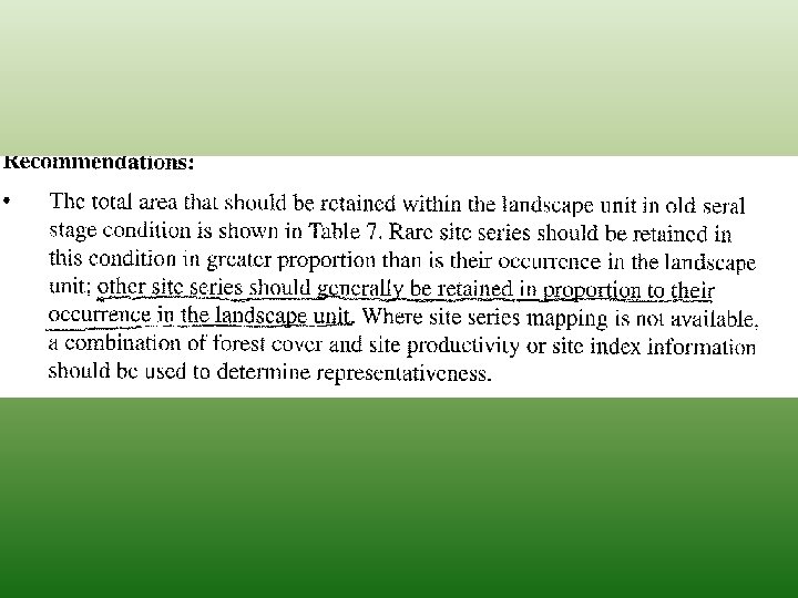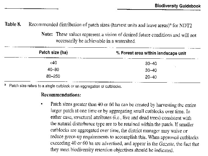 Well, this didn’t go over well • Granted, the timber supply impacts were real, but ecological representation had been a fundamental principle from 1987 onwards. • Plus, there were other problems in the Biodiversity Guidebook which needed attention (see Pollack et al 1997). The old and early seral targets were questionable at a number of levels. As a starting point they were fine, but they desperately needed to be revisited. • And this was not the only way to mitigate timber supply impacts. You could do so, and achieve patch targets (perhaps the most important LU objective of all) by going to an attribute-based definition of old growth rather than just age. • Plus, having a biologically defensible old growth strategy allowed us to practically eliminate adjacency constraints on short term timber supply.