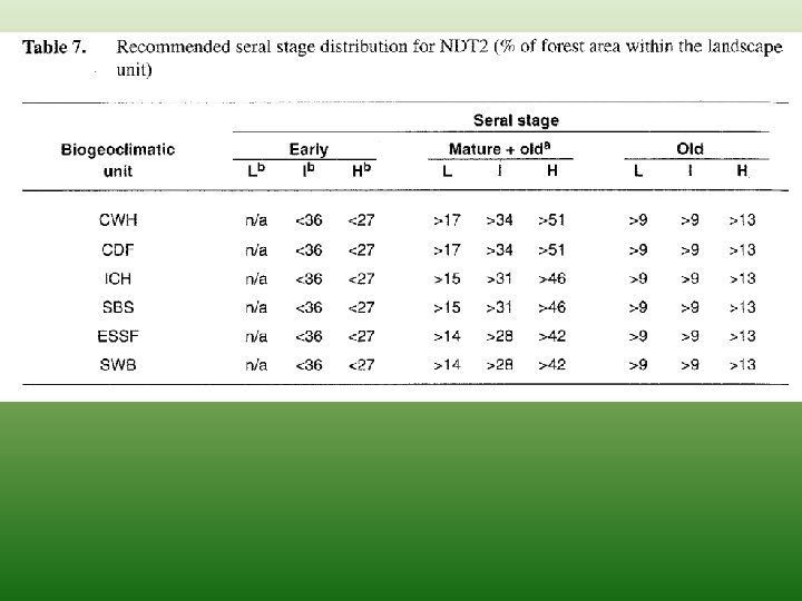 Early Seral Patch Analysis • Amazingly, the targets for old growth and early seral patch size distribution are still unchanged from 1995. • Some people tended to view early seral patch sizes as hard targets. We did not. • The Code established a 40 hectare maximum cutblock size which could be exceeded with an ecological justification. • The early seral patch analysis (ESPA) was developed to provide this. However, it was used more for tracking purposes than as a hard target. • There were other ecological justifications for introducing a range of harvest patch sizes, especially if forest health was an issue. • We encountered relatively little opposition to the introduction of large cutblocks. We also found that it was not always a simple thing to find a suitable location given all the resource values to consider.