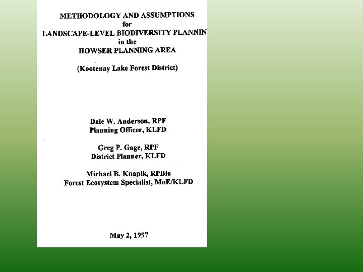 Well, that never happened • During the Great Purge of 2002, the planning function was largely removed from the Forest Service and a new ministry created: MSRM (later ILMB). • Planning moved from the District to the Regional (land use) level. Endless KBLUP debate ensued and landscape unit planning was all but forgotten. Though, in Kootenay Lake, with Mike Knapik’s help, we did do a few.