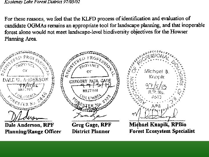• 1998: Chief Forester direction to consider ecological representation of old growth only to the subzone/variant level. • 1999: Landscape Unit Planning Guide (KL is one of 3 Districts to pilot this in BC; see our report) • 1997 -2000: KL implements spatial draft “old seral patches” to address deficit issue, along with a harvest patch management system (size range) • 2001 -2002: KB HLPO includes critical footnote “K” which allows old growth to be identified based on biophysical attributes rather than age • 2006: ILMB (Stew Clow) revises KL draft spatial OGMAs
