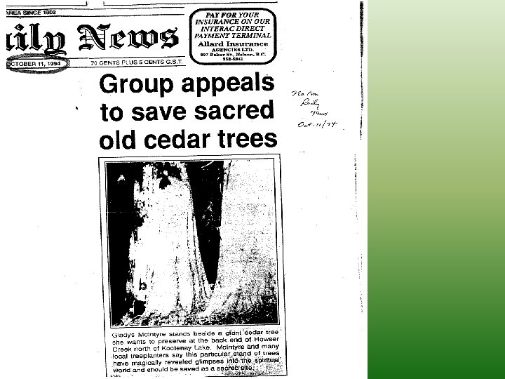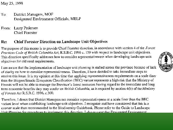 Back to 1995 • During the “Singing Forest” issue, government (Mo. E and Mo. F) agreed to address the old growth issue in K 21 using the newly released Biodiversity Guidebook. • The Guidebook included a recommendation to obtain proportionate representation by site series. • This meant that inoperable forest could not meet full old growth requirements. • Timber impacts in K 21 were roughly 7% of THLB. In 1996, a study on Code related timber supply impacts assumed only 2. 1% impact due to old growth. • So, Meadow Creek Cedar wrote to the Chief Forester complaining about this discrepancy. Old growth requirements varied between 9 and 28% across the province. A proportionate impact on THLB would have had a devastating impact, especially if there was no provision for a recruitment strategy in deficit units.