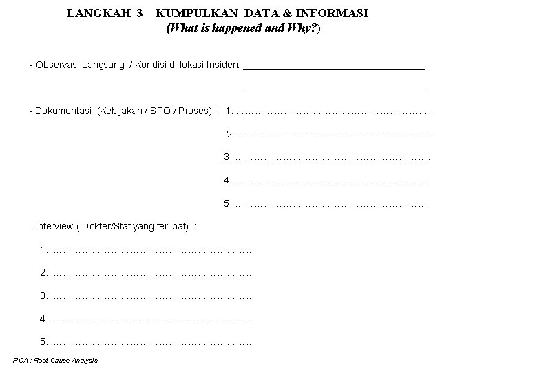 LANGKAH 1 & 2 IDENTIFIKASI INSIDEN DAN TENTUKAN TIM INSIDEN : ____________________________________ (What is wrong) ____________________________________ WAKTU INSIDEN : ………………………. . LOKASI INSIDEN : ……………. AREA / PELAYANAN YANG TERKAIT INSIDEN ………………………………. TIM : Ketua : ___________________________________ Anggota : 1. ____________ 4. _____________ 2. ____________ 5. _____________ 3. ____________ 6. _____________ Apakah semua area yang terkait sudah terwakili ? YA TIDAK Apakah macam-macam & tingkat pengetahuan yang berbeda, sudah diwakili didalam Tim tersebut? YA TIDAK Siapa yang menjadi Notulen? ____________________ Tanggal dimulai __________ Tanggal dilengkapi _______________ RCA : Root Cause Analysis
