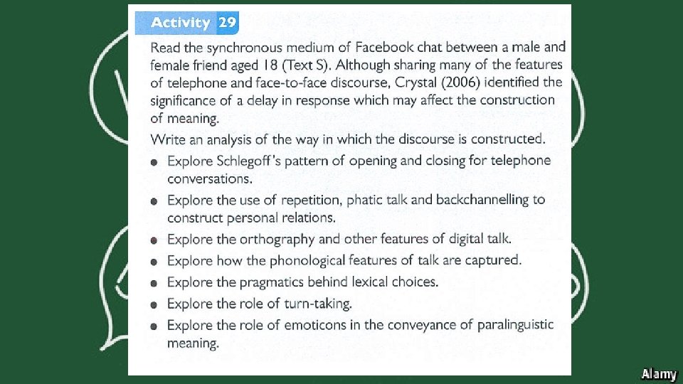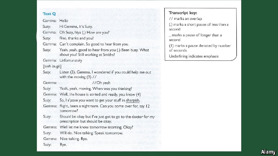 Task • Read the text, a transcript of a telephone conversation between two female friends. • Annotate the transcript using Schlegoff’s framework of analysis, as well as your previous understanding of linguistic features. • You can also consider your knowledge of language and gender.