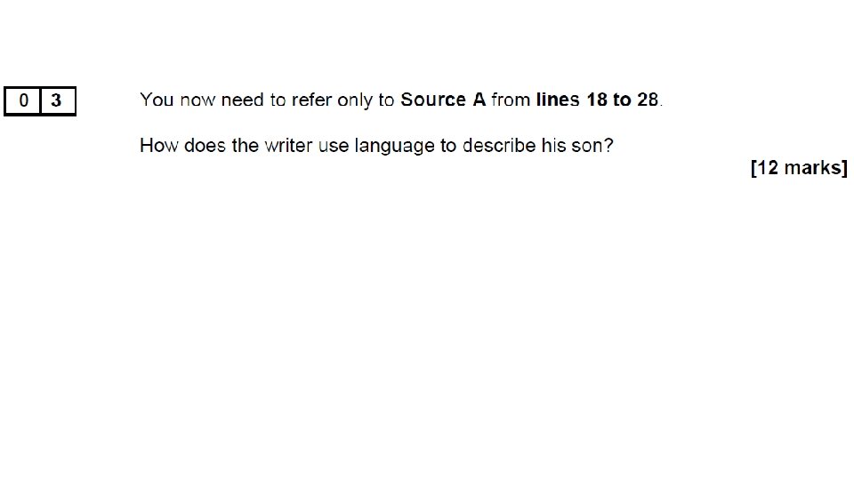 Level? Level 4 Detailed, perceptive 13 -16 marks Level 3 Clear, relevant 9 -12 marks Level 2 Some, attempts 5 -8 marks Level 1 Simple, limited 1 -4 marks Level 0 No marks The writer of Source A, a modern father, is both saddened and pleased by his son’s growth. He finds it difficult to accept that time is moving so quickly; he ‘blinked’ and his son is already a year old. However, the pleasure he feels is also obvious, using phrases like ‘blasting ahead’ to suggest his son is metaphorically taking off like a rocket before his eyes. In contrast, the writer of Source B, who presents a Victorian mother’s perspective, has a negative reaction to her son growing into a young man. She conveys a sense of loss at his independence, even using the phrase ‘My little boy is lost’. By using the word ‘lost’ we understand that she no longer sees herself as part of his life and she regrets that he is no longer dependent on her to ‘replace lost buttons’.