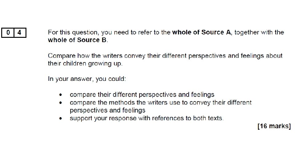 QUESTION 4: AO 3 - Compare writers’ ideas and perspectives Level Skill Descriptors Compare writers’ ideas and perspectives, as well as how these are conveyed, across two or more texts Level 4 Detailed, perceptive 13 -16 marks Level 3 Clear, relevant 9 -12 marks Level 2 Some, attempts 5 -8 marks Level 1 Simple, limited 1 -4 marks Level 0 No marks Shows a detailed understanding of the differences between the ideas and perspectives Compares ideas and perspectives in a perceptive way Analyses how methods are used to convey ideas and perspectives Selects range of judicious quotations from both texts Shows a clear understanding of differences between the ideas and perspectives Compares ideas and perspectives in a clear and relevant way Explains clearly how methods are used to convey ideas and perspectives Selects relevant quotations to support from both texts Identifies some differences between the ideas and perspectives Attempts to compare ideas and perspectives Some comment on how methods are used to convey ideas and perspectives Selects some quotations/references, not always supporting (from one or both texts) Simple awareness of different ideas and/or perspectives Simple cross reference of ideas and/or perspectives Simple identification of how differences are conveyed Simple references or textual details from one or both texts No ideas offered about differences Nothing to reward