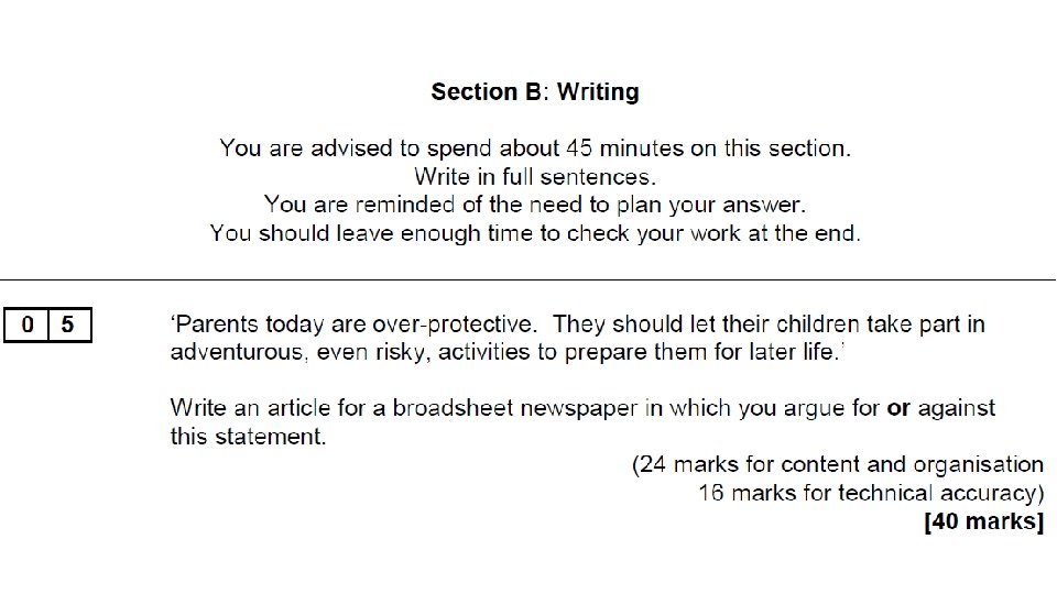 QUESTION MARKS MINS Read the questions and annotate source 0 10 Question 1 – True or False 4 5 Question 2 - Select and Synthesise q Source A – 3 PEE paragraphs q Comparative Connective: However, Whereas, In contrast, q Source B – 3 PEE paragraphs q Comparative Overview 8 10 -12 Question 3 – Language Analysis 12 10 -15 16 15 -20 q 4 Technique, Evidence, Effect paragraphs q word classes and phrases q paragraphs on language features q paragraphs on sentence forms Question 4 – Compare Writers’ Ideas and Perspectives q. Overview comparative statement about theme in sources – identify text type/content/tone/purpose/narrative mode of each source q. Source A - Point q. Evidence q. Technique – word classes and phrases, language features and techniques, sentence forms and structure q. Explanation q. Source B - Comparative/Contrastive Point: On the other hand, Source B… q. Evidence q. Technique – word classes and phrases, language features and techniques, sentence forms and structure q. Explanation ESSENTIALLY, IT’S 6 PETER PARAGRAPHS – 3 PETER PARAGRAPHS FOR EACH SOURCE