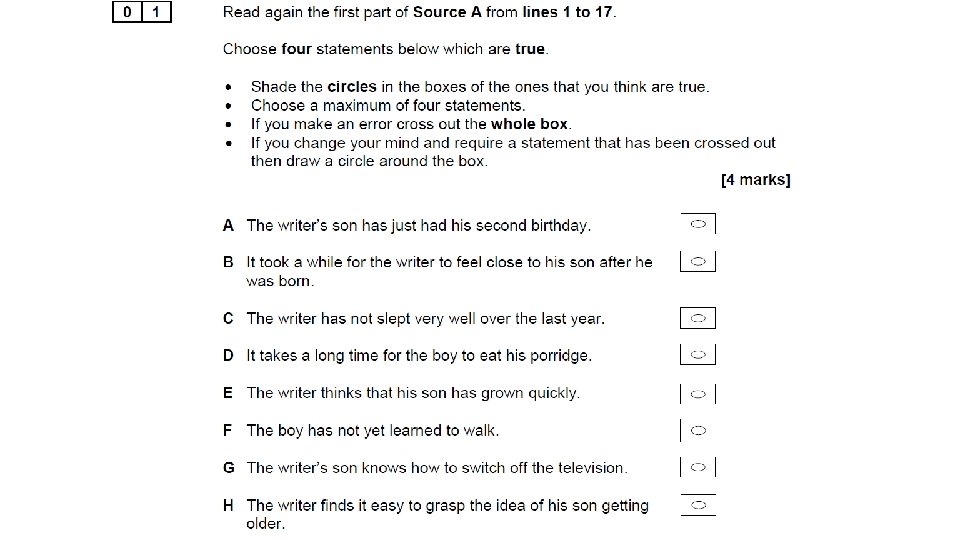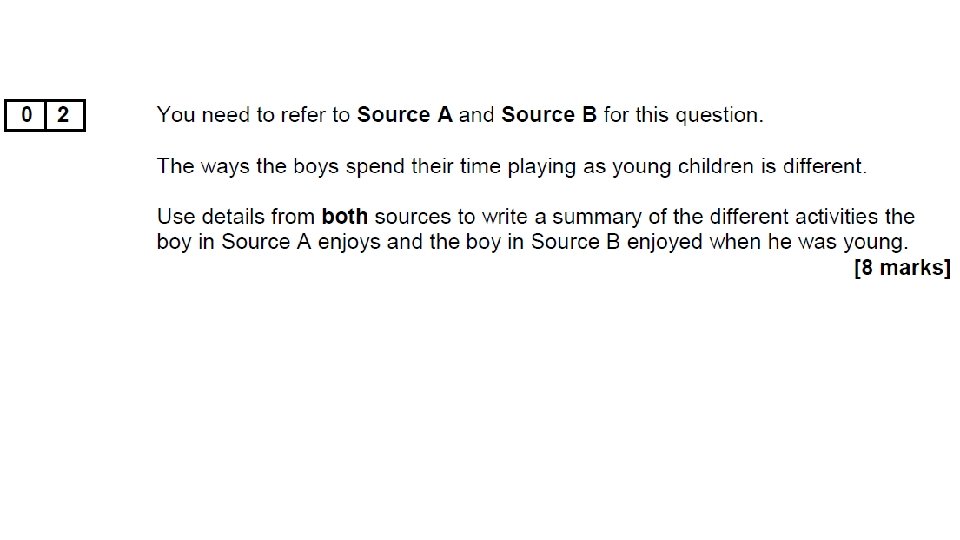Level? Level 4 Perceptive, detailed 7 -8 marks Level 3 Clear, relevant 5 -6 marks Level 2 Some, attempts 3 -4 marks Level 1 Simple, limited 1 -2 marks Level 0 No marks In Source A the boy is only a year old but still makes his presence felt around the house by making lots of noise, especially when he’s tired. He ‘barks gibberish’ in front of people, which suggests he is immature and likes the attention he gets from showing off. However, the boy in Source B is older and more independent and has real toys to play with, like ‘drums and tin trumpets’, which give him the opportunity to be more musical and more mature, rather than just shouting ‘gibberish’ in the middle of the room like the boy in Source A.