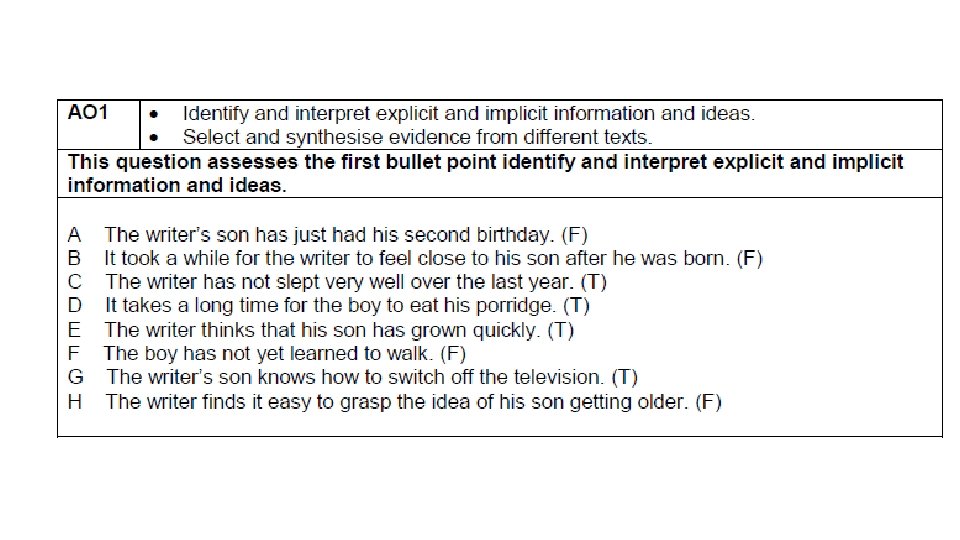 QUESTION 2: AO 1: Identify, Interpret, Select and Synthesise Level 4 Perceptive, detailed 7 -8 marks Level 3 Clear, relevant 5 -6 marks Level 2 Some, attempts 3 -4 marks Level 1 Simple, limited 1 -2 marks Level 0 No marks Skill Descriptors Shows a detailed understanding of differences between the texts Offers perceptive interpretation of both texts Synthesises evidence between texts Selects a range of judicious quotations from both texts Shows a clear understanding of differences between the texts Begins to interpret both texts Demonstrates clear connections between texts Selects relevant quotations/references from both texts to support response Identifies some differences between the texts Attempts some inference from one/both texts Attempts to link evidence between texts Selects some quotations/references; not always supporting (from one/both texts) Shows simple awareness of difference(s) Offers paraphrase rather than inference Makes simple or no links between texts Simple reference or textual details from one/both texts Candidates in this band will not have offered any differences Nothing to reward