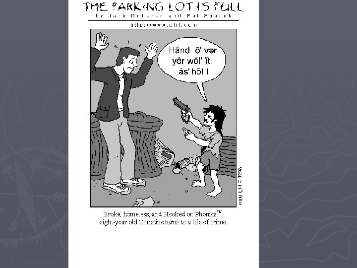 Examples: Ambiguity ► Larry raises miniature badgers and racoons. ► We need more intelligent leaders. ► Iraq Bombs Gut Factory (headline) ► Free Wales ► Wet Paint ► The little girl hit the child with the toy ► Squad Helps Dog Bite Victim (headline) ► Teacher Strikes Idle Kids (headline) http: //grammar. about. com/od/terms/g/ambiguity. htm http: //answers. yahoo. com/question/index? qid=20091218063942 AAkj. B 1 T