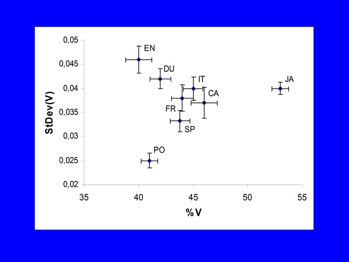 Material • 8 languages, 4 speakers per language, and 5 sentences per speaker = 160 sentences. • Segmentation into consonantal and vocalic intervals. • Three variables computed for each sentence: – %V proportion of vocalic intervals (= 1 - %C); – V standard deviation of vocalic interval durations within the sentence; – C standard deviation of consonantal interval durations within the sentence;