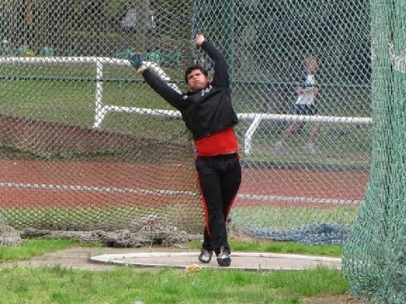 Tronco: rotaciones a la altura de la cadera para favorecer el volteo. El martillo alcanza el 60% de su velocidad.