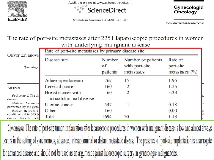 Laparoscopic surgery for Ovarian Cancer The adequacy of minimally invasive surgery compared to traditional laparotomy for staging. The risk of tumor cyst rupture. The incidence and long-term implications of port-site metastases. The effect of CO 2 pneumoperitoneum on tumor growth.