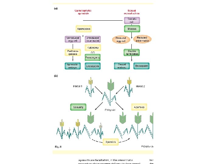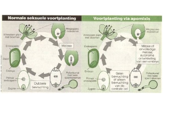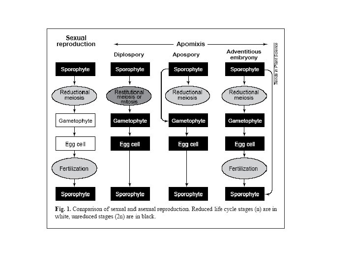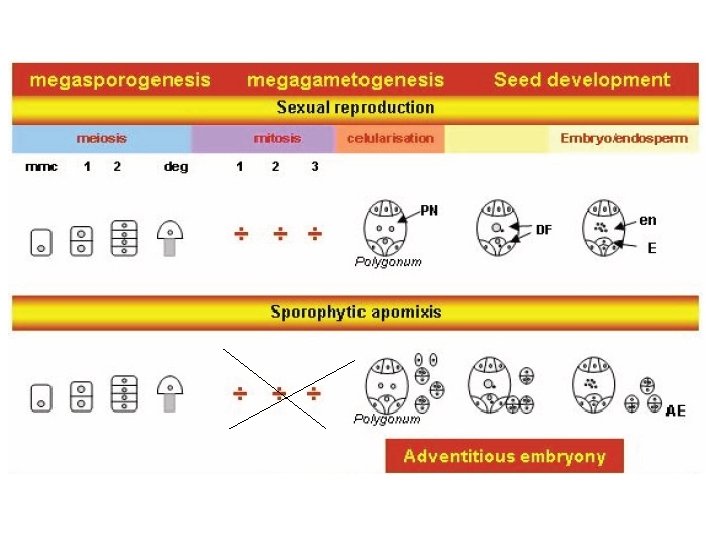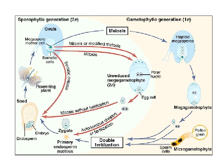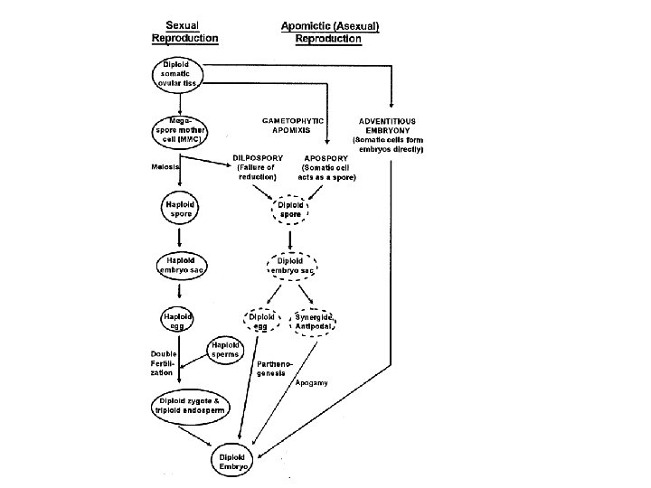 Apomissia: riproduzione asessuata con formazione di semi Embrionia avventizia: una sottocategoria dell’apomissia in cui l’embrione si differenzia direttamente da una cellula somatica senza formazione di un megagametofito. La via sessuale resta funzionale e l’embrione si nutre di endosperma prodotto per via sessuata Apomissia gametofitica: il megagametofito deriva da una cellula Uovo derivante da un sacco embrionale non ridotto Diplosporia apomittica: il megagametofito si sviluppa dalla cellula madre della megaspora non ridotta Aplosporia apomittica: la megaspora ridotta degenera ed è sostituita da una cellula somatica. Il sacco embrionale non è ridotto. Sia la diplosporia che l’aposporia sono forme di apomissia gametofitica In cui un megagametofito produce un embrione partenogenetico