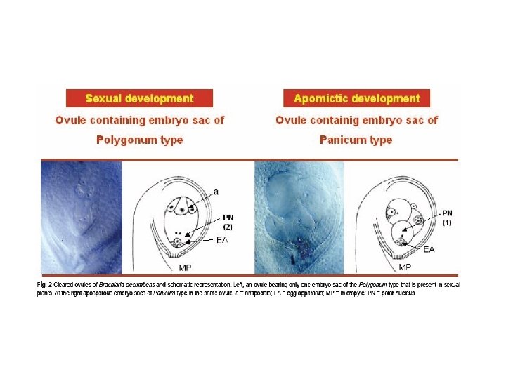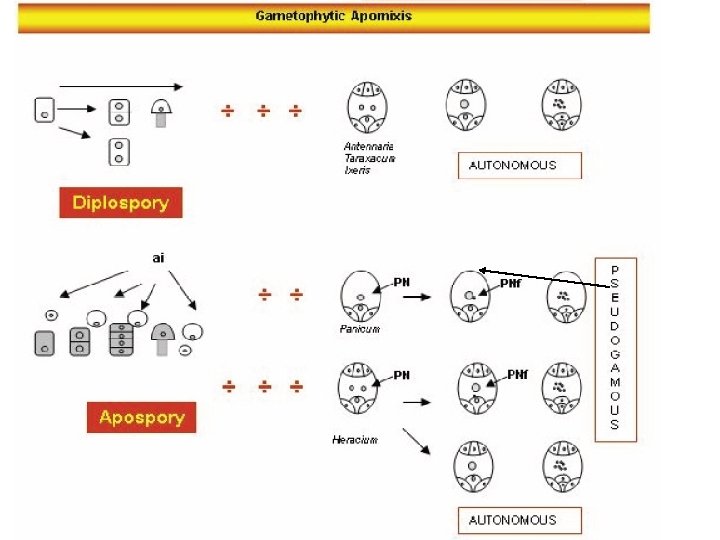 L’apomissia gametofitica è caratterizzata da apomeiosi: la meiosi è o alterata o totalmente bypassata e come conseguenza si forma un Gametofito femminile non ridotto. Non avviene la fusione dei gameti e la cellula uovo si sviluppa atonomamente per partenogenesi Nella diplosporia: la cellula madre della megaspora fallisce la meiosi, per Mitosi forma un sacco embrionale con tutte le cellule non ridotte distribuite Come nel sacco embrionale normale. Il processo sessuale è compromesso Totalmente;