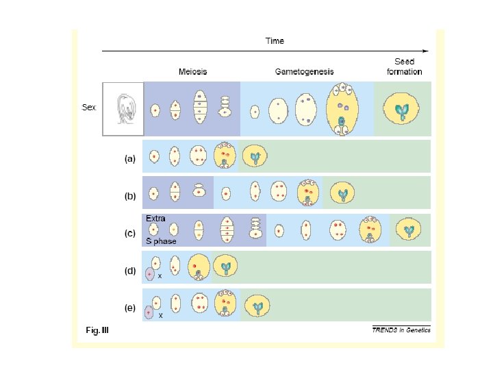 Agamogenesi: l’embrione deriva da una cellula uovo non fecondata mediante Una meiosi modificata Agamospermia (apogamia): un embrione nucellare è formato dal tessuto Attorno al sacco embrionale Questa modalità si trova in circa 35 famiglie di angiosperme Asteraceae, Rosaceae, Poaceae, Orchidaceae e Liliaceae, : Cupressus dupreziana, i semi derivano interamente dal polline