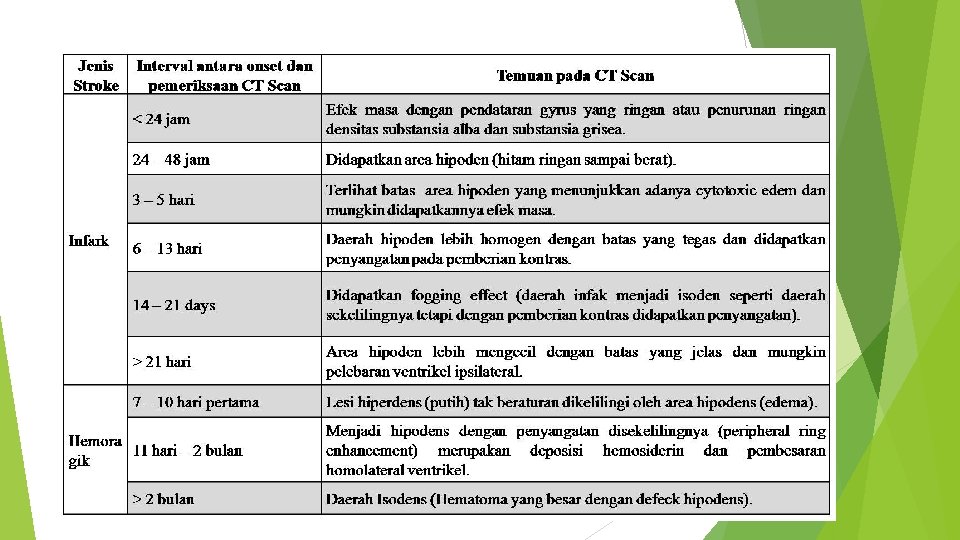 Gejala Awal Stroke Perdarahan Stroke Iskemik Gejala Peningkatan TIK Muncul pada awal serangan Dapat muncul kemudian, atau tidak -Nyeri Kepala muncul -Penurunan Kesadaran -Muntah Menyemprot -Pandangan Ganda Gejala Lateralisasi Dapat muncul kemudian, -Kelemahan anggota gerak sesisi atau tidak muncul -Baal sesisi -Otonom (BAB, BAK, keringat) Muncul pada awal serangan