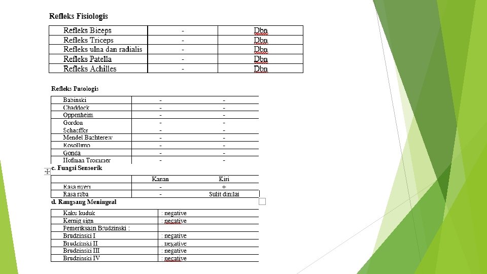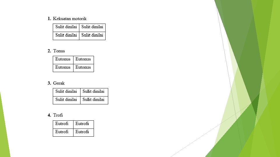 Nervus Pemeriksaan Kanan Kiri N. I. Olfaktorius Daya penghidu Tidak dinilai Daya penglihatan Tidak dinilai Pengenalan warna Tidak dinilai Lapang pandang Tidak dinilai Ptosis - - Gerakan mata ke medial Sulit dinilai Gerakan mata ke atas Sulit dinilai Gerakan mata ke bawah Sulit dinilai Ukuran pupil 3 mm 3 mm Bentuk pupil Bulat N. II. Optikus N. III. Okulomotor N. IV. Troklearis Refleks cahaya + + Strabismus divergen - - Gerakan mata ke lat-bwh - - Strabismus konvergen - - Menggigit Sulit dinilai Membuka mulut Sulit dinilai Sensibilitas muka Sulit dinilai Refleks kornea + + Trismus - - Gerakan mata ke lateral Sulit dinilai Strabismus konvergen Sulit dinilai Kedipan mata - - N. V. Trigeminus N. VI. Abdusen N. VII. Fasialis Lipatan nasolabial - - Sudut mulut dbn Mengerutkan dahi Sulit dinilai Menutup mata + + Sulit dinilai Menggembungkan pipi Sulit dinilai Daya kecap lidah 2/3 ant Sulit dinilai Mendengar suara bisik Tidak dilakukan Tes Rinne Tidak dilakukan Tes Schwabach Tidak dilakukan Meringis N. VIII. Vestibulokoklearis