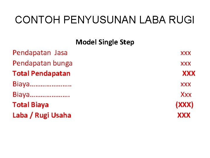 CONTOH PENYUSUNAN LABA RUGI Model Single Step Pendapatan Jasa Pendapatan bunga Total Pendapatan Biaya…………………. Total Biaya Laba / Rugi Usaha xxx XXX xxx Xxx (XXX) XXX