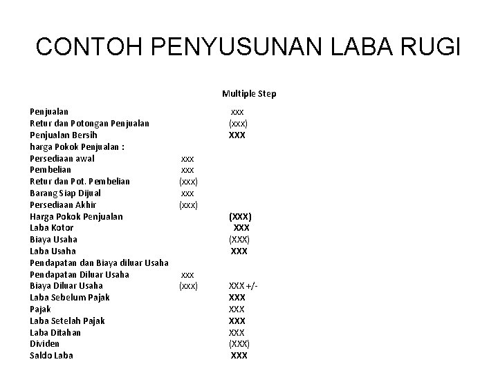 CONTOH PENYUSUNAN LABA RUGI Multiple Step Penjualan Retur dan Potongan Penjualan Bersih harga Pokok Penjualan : Persediaan awal Pembelian Retur dan Pot. Pembelian Barang Siap Dijual Persediaan Akhir Harga Pokok Penjualan Laba Kotor Biaya Usaha Laba Usaha Pendapatan dan Biaya diluar Usaha Pendapatan Diluar Usaha Biaya Diluar Usaha Laba Sebelum Pajak Laba Setelah Pajak Laba Ditahan Dividen Saldo Laba xxx (xxx) XXX xxx (xxx) (XXX) XXX XXX +/XXX XXX (XXX) XXX