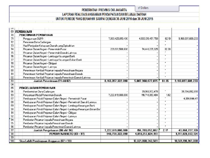 ISI LAPORAN REALISASI ANGGARAN ISI LRA Surplus/defisit-LRA DEFINISI Penerimaan Pembiayaan Semua penerimaan Rekening Kas Umum Negara/Daerah antara lain berasal dari penerimaan pinjaman, penjualan obligasi pemerintah, hasil privatisasi perusahaan negara/daerah, penerimaan kembali pinjaman yang diberikan kepada fihak ketiga, penjualan investasi permanen lainnya, dan pencairan dana cadangan Pengeluaran Pembiayaan Semua pengeluaran Rekening Kas Umum Negara/Daerah antara lain pemberian pinjaman kepada fihak ketiga, penyertaan modal pemerintah, pembayaran kembali pokok pinjaman dalam periode tahun anggaran tertentu, dan pembentukan dana cadangan Selisih lebih/kurang antara pendapatan – LRA dan belanja selama satu periode pelaporan dicatat dalam pos Surplus/Defisit LRA 6