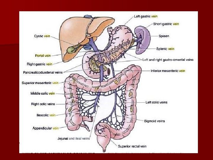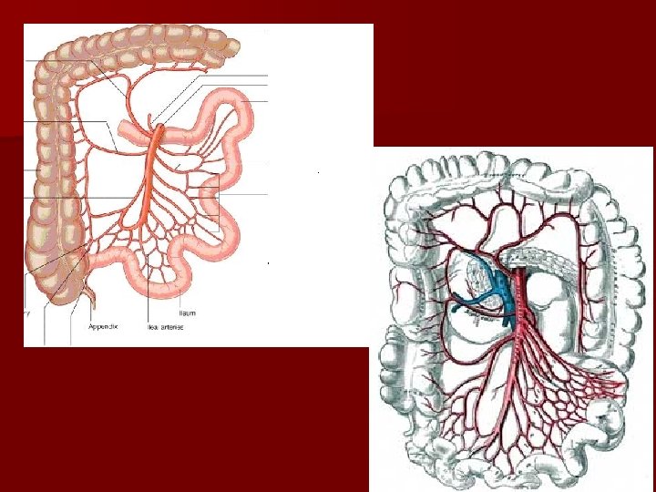 arcada arterielle paracolique droite et gauche n Veines - veine mesenterique superieure et veine mesenterique inferieure n n Lymphatiques - ganglions epicoliques, ganglions retro-duodeno-pancreatiques n Innervation – vegetatif: plexus mesenterique superieur et plexus mesenterique inferieur
