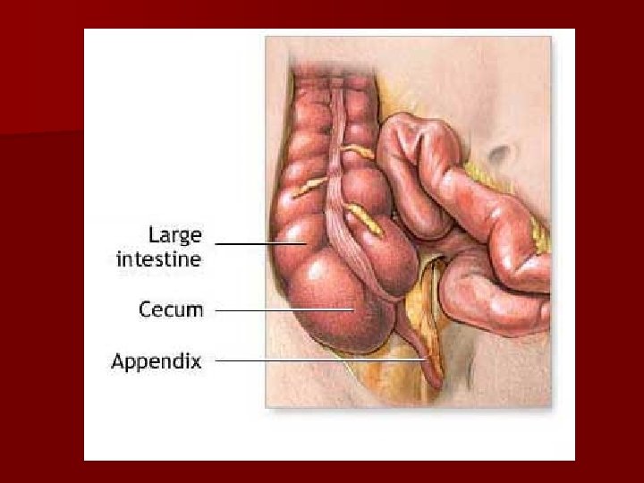 CÆCUM ET APPENDICE n n n Cul de sac de 6 cm Sous le plan dirigé par le bord inferieur de l’orifice ileo-caecal Sur le bord mediale – l’ appendice vermiculaire Dans la fosse iliaque droite ou ectopique trois teniae musculaires qui ont l’origine au point d’ implantation de l’appendice- 2 -3 cm sous l’orifice de l’intestine grêle