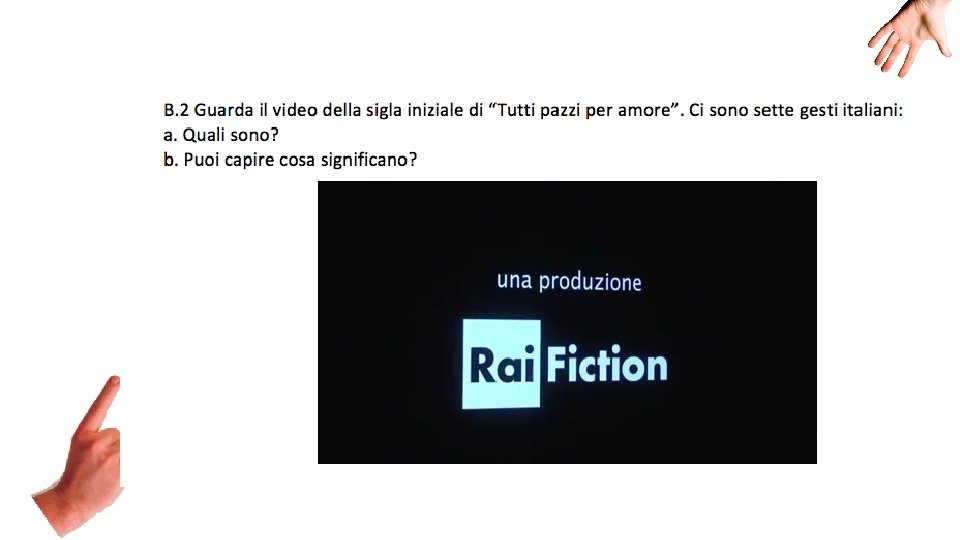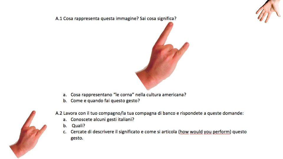 Unità d’apprendimento • Gruppo livello Low-intermediate • Warm up: • Obbiettivo: introdurre il tema dei gesti. Individuare conoscenze pregresse e creare consapevolezza culturale sulla differenza che uno stesso gesto o uno simile ha nella cultura italiana e in quella americana.