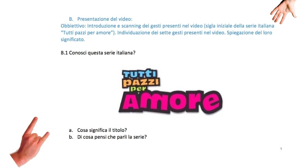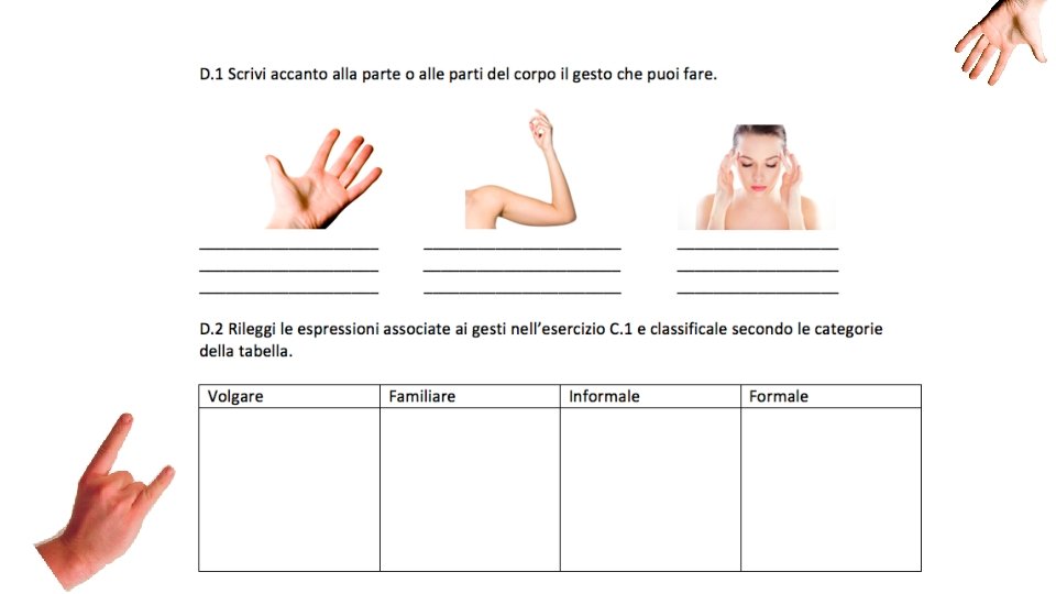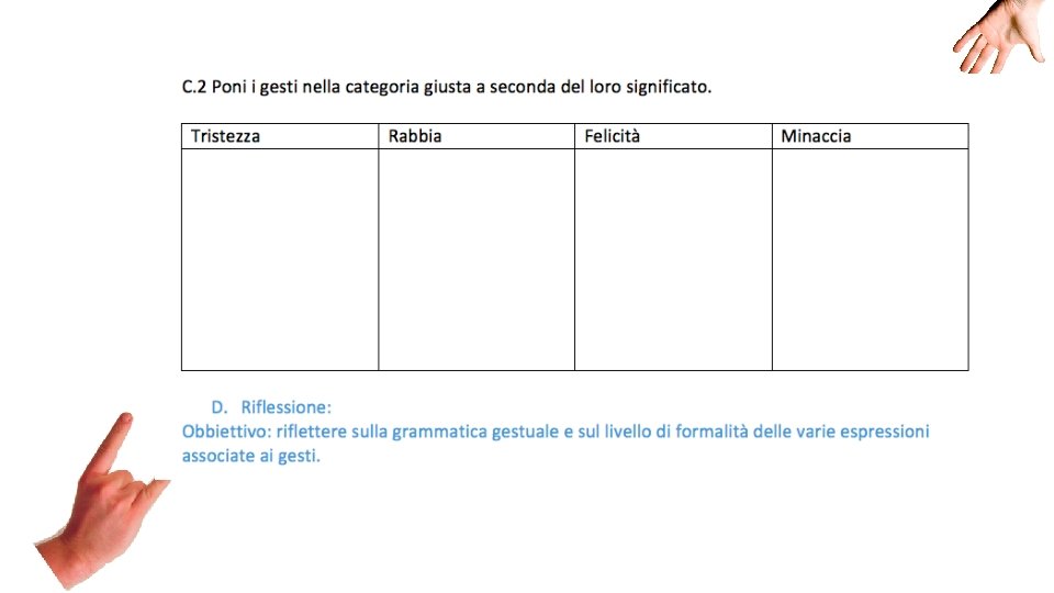 C. Analisi: • Obbiettivo: riflettere sul significato dei gesti italiani. Scoprire i “sinonimi” e lavorare con i vari registri.