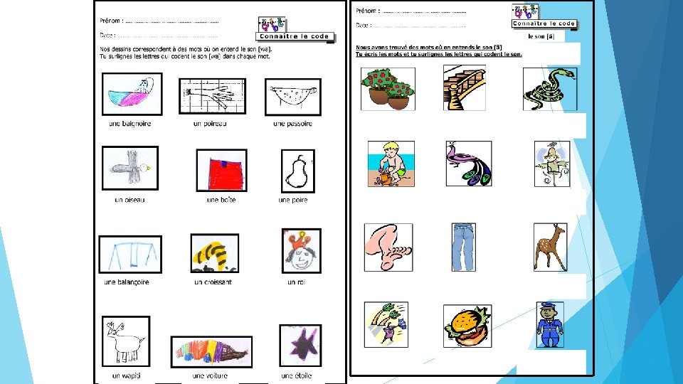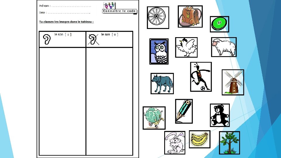 1. S’assurer de la qualité de la discrimination auditive des élèves en ce qui concerne le phonème étudié. (Les situations varient selon les phonèmes étudiés et le moment de l’année) Faire dessins qui correspondent à des mots qui contiennent le phonème étudié (tâche individuelle préparatoire qui peut être effectuée à la maison) ; Faire des jeux de type « pigeon vole! » ; Repérer la place du phonème étudié dans des mots oraux; Classer des images selon le critère j’entends/je n’entends pas (tâche individuelle).