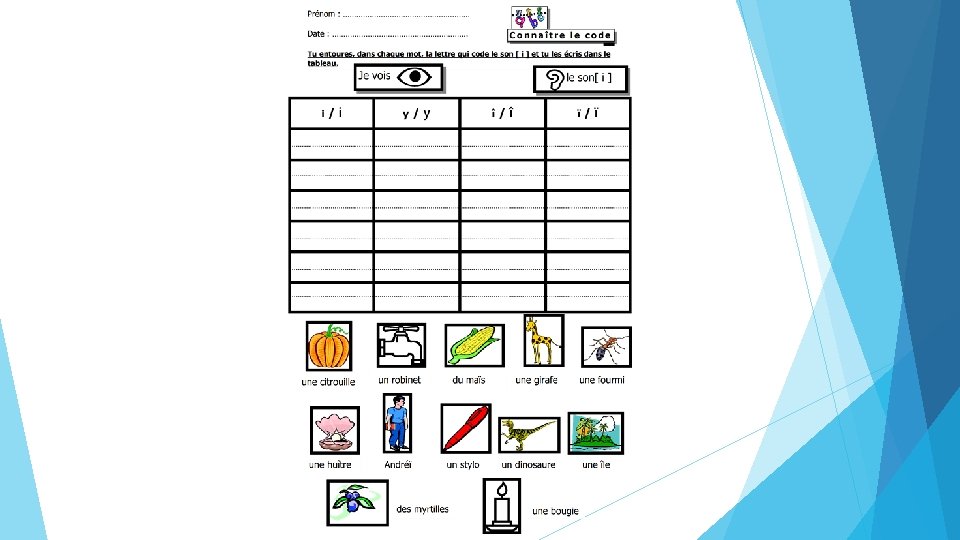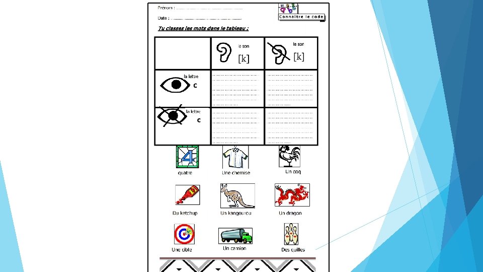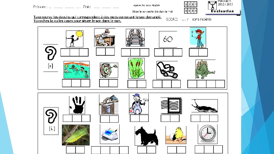 Prénom : ………………………… Date : …………………………. Connaître le code J Ces dessins correspondent à des mots où on entend le son [ ]. Tu coches la place du son dans le mot.