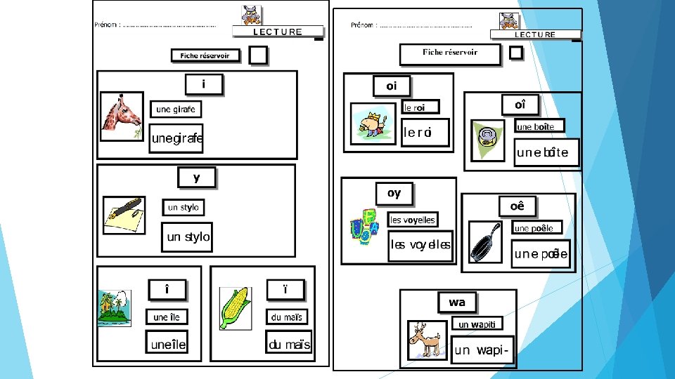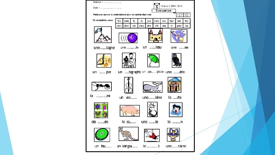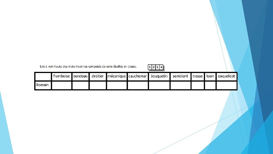 La visée des exercices est d’accélérer la prise de conscience phonologique (la capacité à prendre conscience que la parole peut s’analyser en unités constitutives: mots/syllabes/phonèmes), la découverte du lien entre « i » et « i » . Sur le plan de la mémoire, il faut libérer des ressources cognitives en orientant et guidant l’attention de l’élève. Pour cela, - Il faut s’appuyer sur la répétition verbales par des stimuli auditifs. - Il faut travailler à partir d’un petit nombre de correspondances phonies graphies. - Il faut s’appuyer sur la mémoire phonologique à partir de mots réguliers. - Il faut utiliser 4 des 21 structures syllabiques les plus fréquentes (91%): C/ V (pa), V (a), CVC (bal), CCV (bleu).