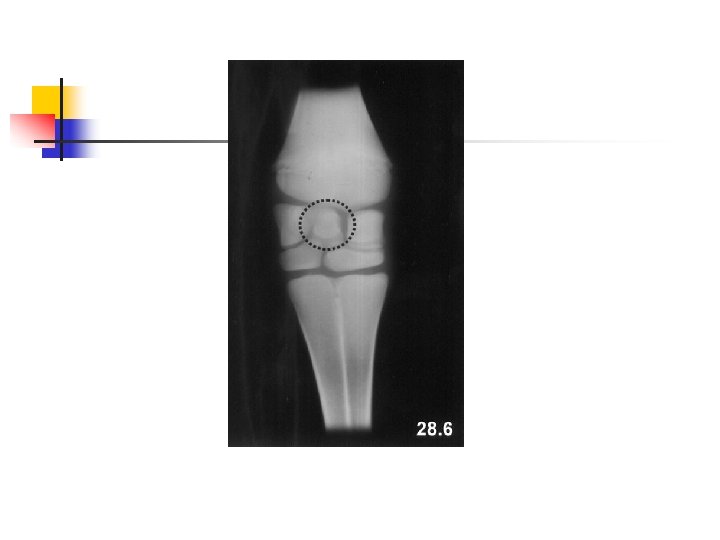 Navicular Bone n Dorsopalmar/Dorsoplantar Oblique View n n n Can be done as with Dorsopalmar/Dorsoplantar oblique view of distal phalanx. Can be done on block specially designed with grooves that hold hoof at an angle. X-ray beam is directed parallel to the ground. View should include second and third phalanges. Flexor View n n Foot is placed on top of cassette in cassette tunnel. Fetlock should be in extended position.