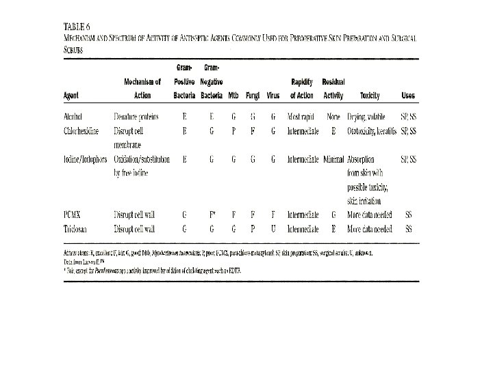 Skin Preparation • After shaving and removing organic debris, follow by a surgical scrub alternating between disinfectant (e. g. iodophors or chlorhexidine) and alcohol. – Iodophors (e. g. Betadine®, Prepodyne®, Wescodyne®) inactivate a wide range of microbes but their activity is reduced in the presence of organic mater. – Chlorhexidine (e. g. Novalsan®, Hibiclens®) are rapidly bactericidal, persistent and active against many viruses. They are active even in the presence of blood. – Note: antiseptic soaps and solutions must be kept in covered containers to avoid contamination. Certain bacteria and fungi can survive in these products. • Sterile surgical gloves should be worn for the final skin preparation. Supplies, including solutions, must be sterile. • A gauze sponge can be used for scrubbing. During the scrub, the process should begin along the incision line and extend outward and never from outward (dirty) towards the center (clean). Do not go over the incision site with the same scrub. • Continue until the skin has had 5 minutes of contact time with the antiseptic. • At the end of the scrub apply a coat of germicide. Reapply the germicide in the operating room.