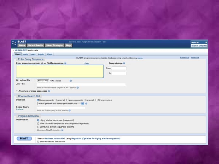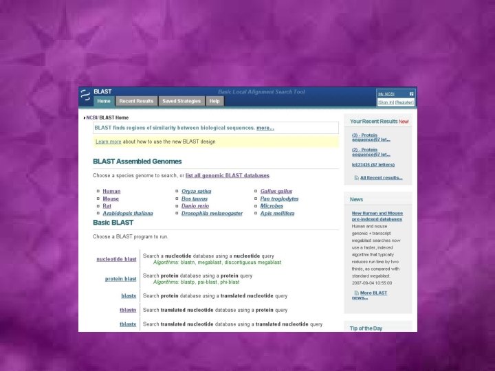 Sequence database search algorithms • Smith-Waterman: First developed algorithm • FASTA (Fast Alignment)- The first fast and sensitive method for sequence database search: A useful FASTA-based tool for comparing two sequences, LALIGN, is available at http: //fasta. bioch. virginia. edu/fasta/lalign 2. htm. • BLAST (Basic Local Alignment Search Tool): The most commonly used suite of programs for fast similarity searches in nucleotide or protein sequence databases.