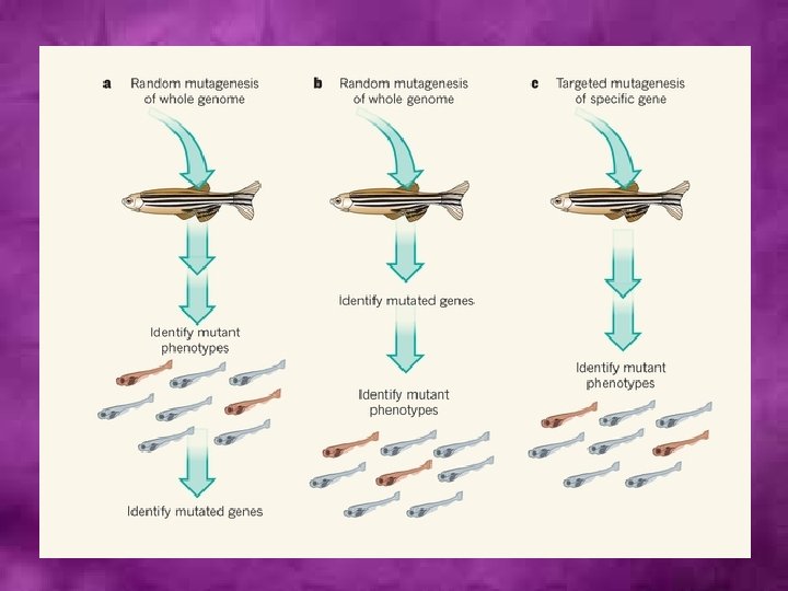 Genome-wide random mutagenesis • It is a strategy applicable to all organisms • Mutations are induced by mutagens • Essentially, the idea behind such an experiment is to mutagenize a population of whatever species is under study and recover enough mutants to stand a reasonable chance that each gene in the genome has been “hit” at least once. • This population can then be screened to identify mutants in a particular function. • For example, large-scale screens have been carried out in the past to look for replication mutants in bacteria, cell-cycle mutants in yeast, and more recently, developmental mutants in Drosophila and the zebrafish.