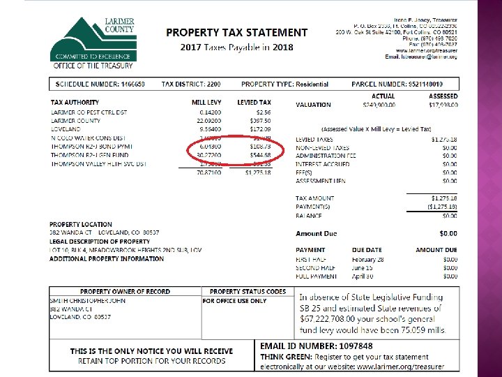 Taxing Authorities use money collected to provide services to the citizens Our homes and business form the tax base from which taxes are derived to fund local governments and services Property is assessed by the Assessor The Larimer County Property Tax Cycle Taxing Authorities set the Mill Levy by which taxes are calculated The Treasurer distributes the tax money collected to the Taxing Authorities The taxpayer receives their Tax Statement in January The Treasurer prepares the Tax Roll and mails out the statements