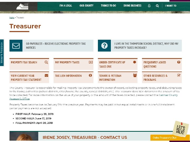 Larimer 101 March 28, 2019 Property Taxes The Larimer County Treasurer’s Office Irene Josey, Treasurer