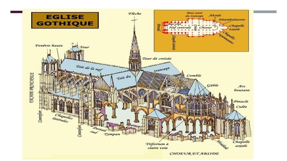 L’ARCHITECTURE GOTHIQUE L’architecture gothique est un style architectural le plus souvent associé aux cathédrales La cathédrale gothique: Le plan de l’église gothique ne diffère que peu de celui de l’église romane : toutes deux reprennent le plan de la basilique paléochrétienne et s’organisent autour d’une nef centrale. Néanmoins, l’édifice gothique se distingue de son cousin roman par la surface qu’il occupe : les églises du XIIème siècle sont des constructions monumentales. L’émulation entre artistes et la concurrence entre bâtisseurs donnent naissance a de gigantesques cathédrales qui se substituent aux édifices antérieurs.