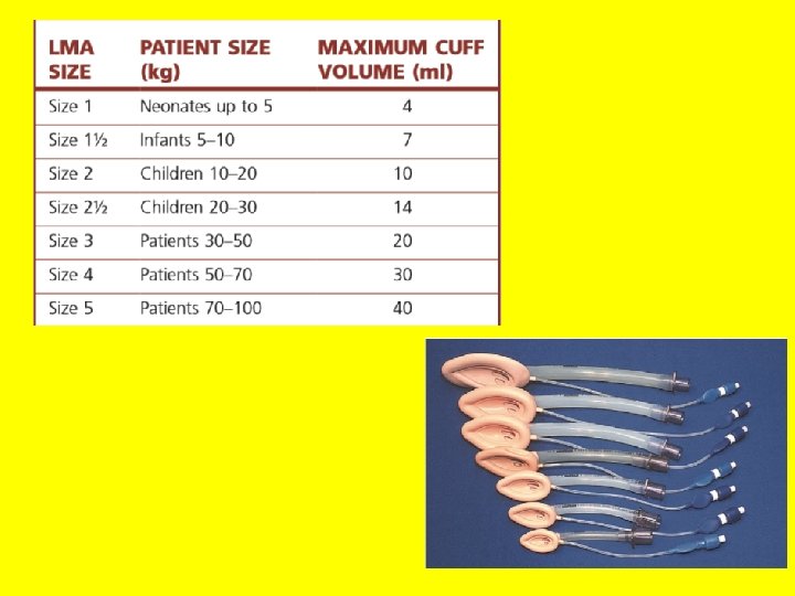 LMA – classic • It consists of an oval soft silicone mask that sits over the larynx with an integrated stem that extends through the oral cavity to allow attachment to the anaesthetic circuit or other appropriate equipment. • Mask when inflated, fits around the laryngeal inlet and supports it in a position away from the posterior pharyngeal wall